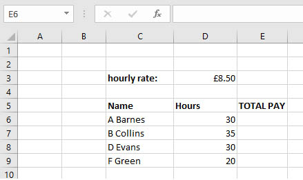 Have a look at the spreadsheet below, we're going to put a formula in cell E6 that will calculate the total pay for each employee. Since we'll use autofill to copy the formula down, we need to make the cells containing pay rates absolute references, so the formula would be: