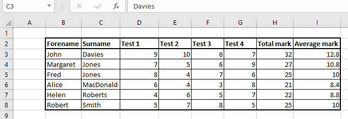 This stops the top row with Forename, Surname, Test 1 and so on being sorted with the rest of the data. But what happens when there's a row at the bottom that shouldn't be sorted?